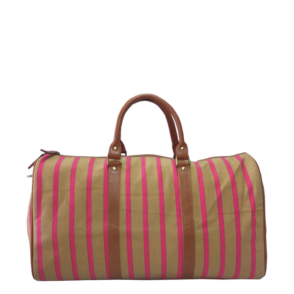 A comfortable, trendy weekender with zipper pockets inside and outside made in striped canvas.
