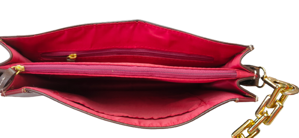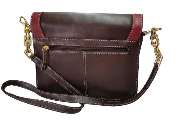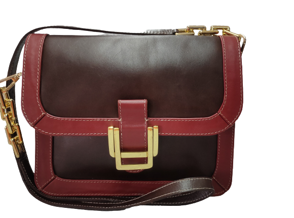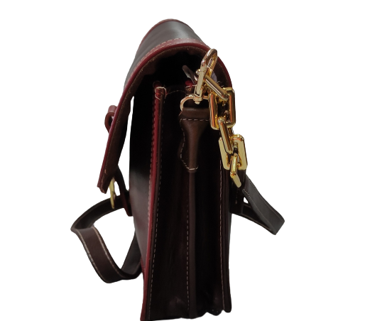 A beautiful sling bag made in veg tanned leather with a combination of brown and red .